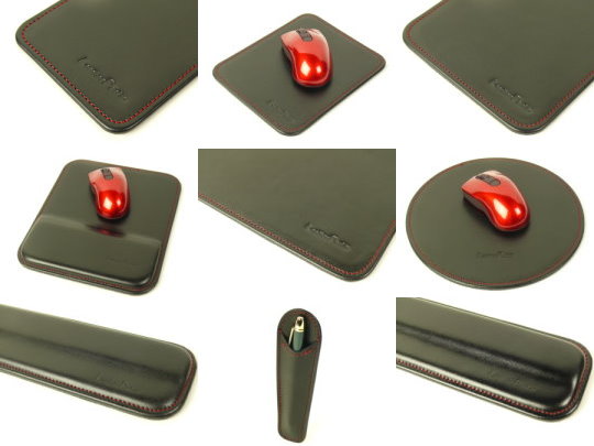 商品は、革がブラック、縫い糸がレッドの革製マウスパッド6商品、リストレスト2商品、革製ペンホルダー1商品と、